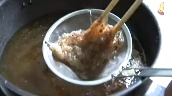 再來看一個(gè)炸東西后,處理臟油的方法。炸東西的時(shí)候,都需要比較多的油,炸完一次全部倒掉很可惜,油里面的渣子怎么樣才能清掉呢?